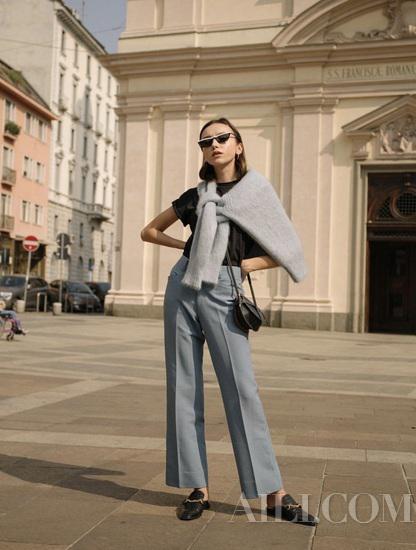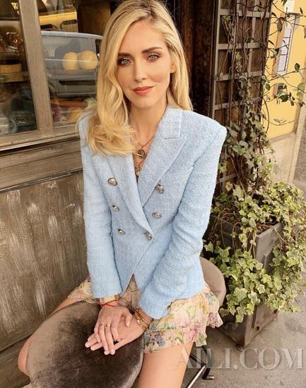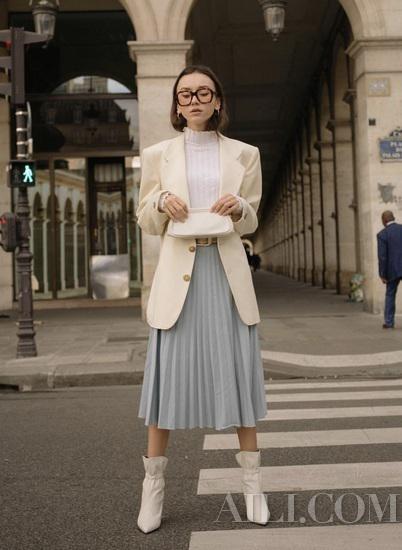 因为奶油蓝在色彩上比较轻盈,所以单品在质地的选择上局限更小。可以是西装这种廓形硬挺质地较为厚重的单品。