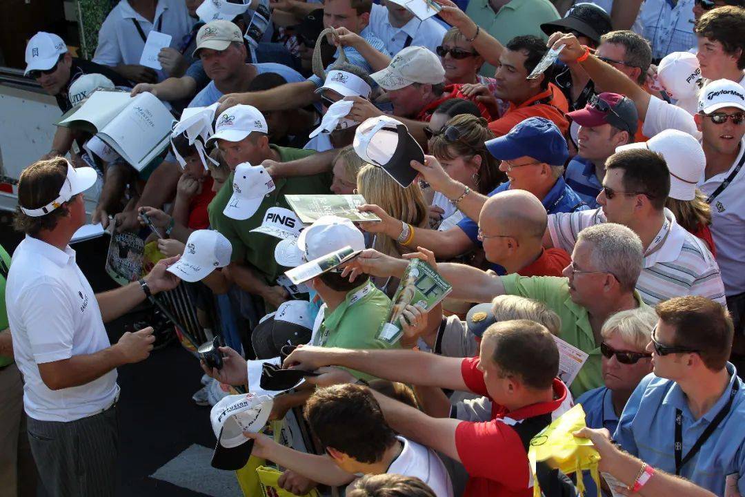 于是就有了球迷们看到的,米克尔森从1号洞就开始的粉丝互动。在墨西哥比赛时,他会用西班牙语与球迷交流,会补偿被球砸到的球迷,会将球给到赛场边可爱的小观众并主动和他们合影,会在每轮结束后花上将近半个小时给球迷签名,签完后右手甚至拿不起一个三文治,还好打球时,老米是个左撇子。