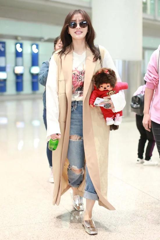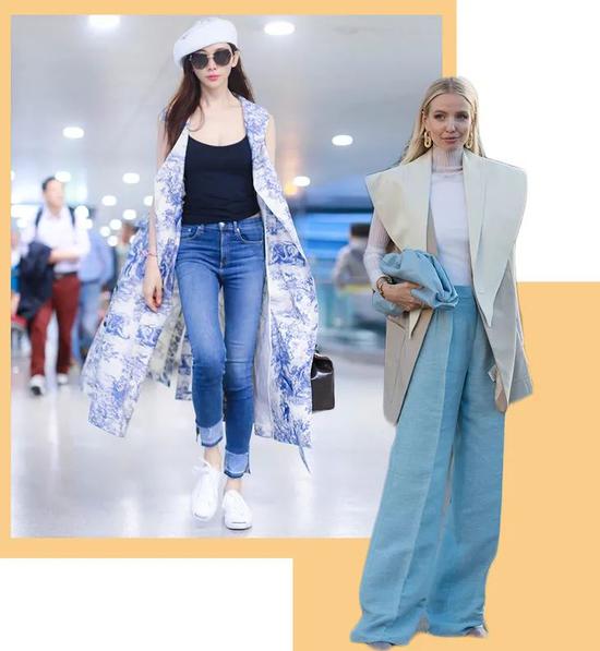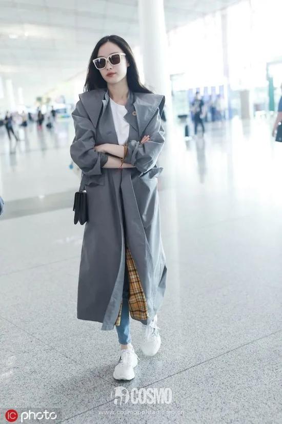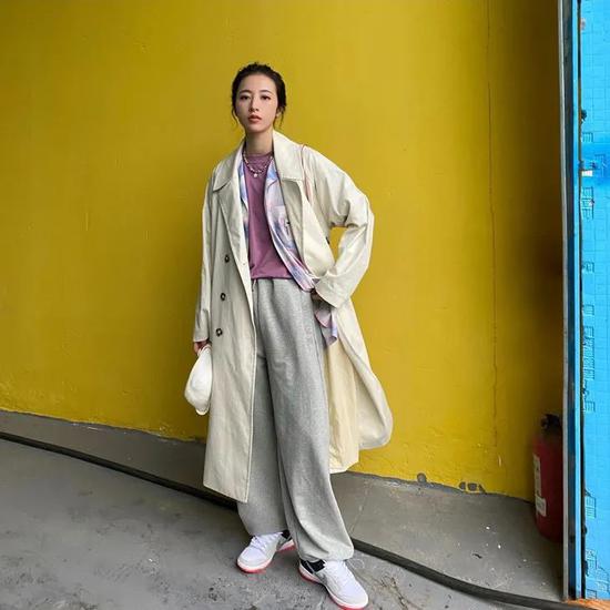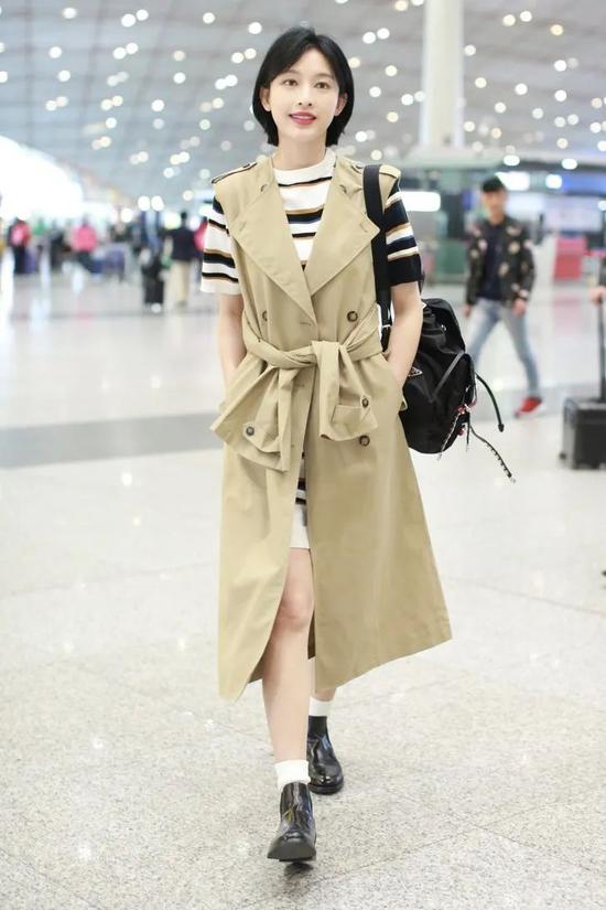 如果你喜欢休闲一些的装束,马甲风衣也能很好的兼具,只要像秦岚一样用上一件图案卫衣就能轻松穿出来。