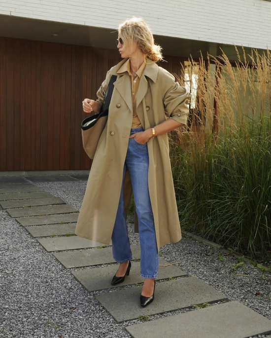风衣想穿出氛围感?可以多用繁简中和的搭配原则,身上有一件单品太过花哨,其余单品都选择简单款式,上下身和谐配合。