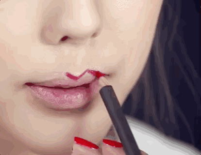 Step2:用与口红颜色相近的唇线笔,在唇峰处画X或者V都可以,先将唇峰勾勒出来。明显的唇峰可以让唇妆更加精致,唇峰要画出M字型的感觉!