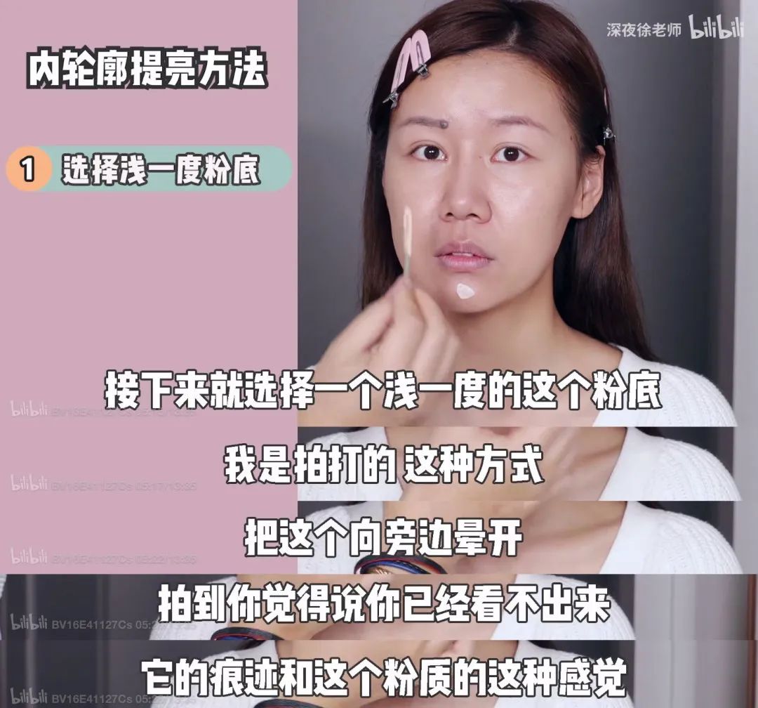 或是通过同系列深/浅两个色号的粉底液的分区使用,来打造脸部的明暗关系,这样会更加的自然。