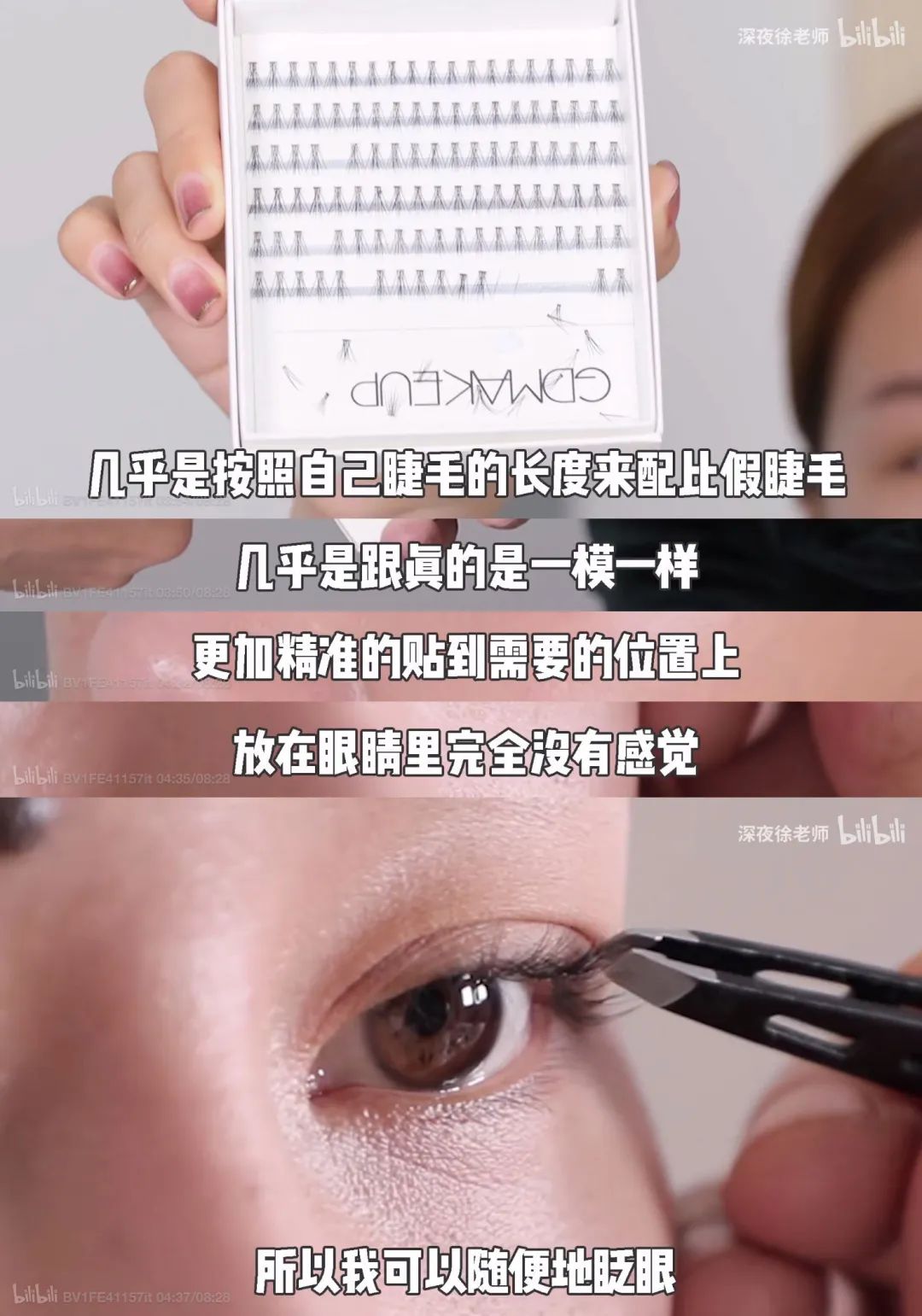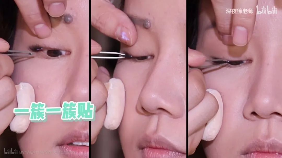 所有视频中,假睫毛都是一簇一簇来贴的。