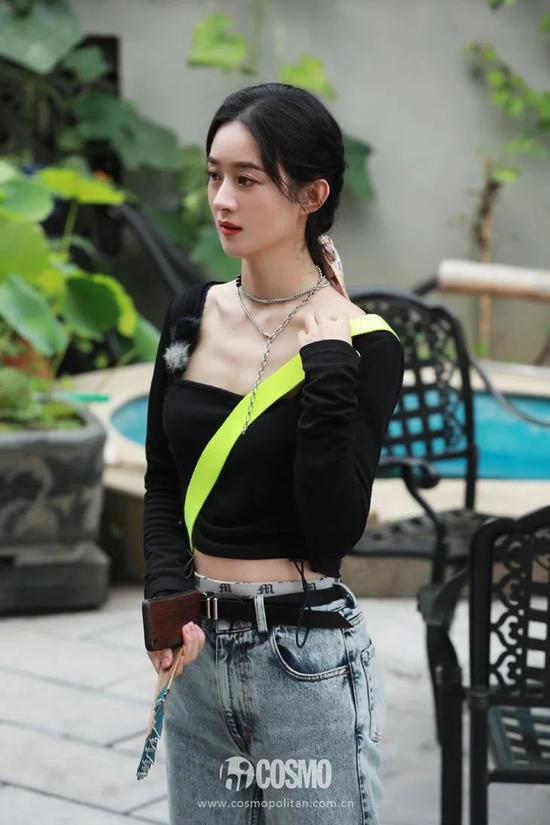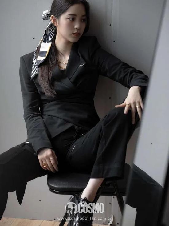 娜娜的同色系黑白丝巾发带的融入一扫沉闷和压抑,在帅气个性中也不缺少女感。