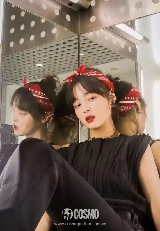 丝巾系在领口和手腕能提升整体气质,但如果作为发带使用,就打破了这种“正式感”,而多了一份女性柔美。颖宝《中餐厅》中的丝巾发带造型就让这种温柔感max。