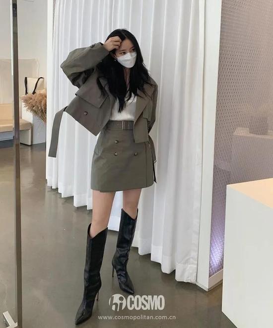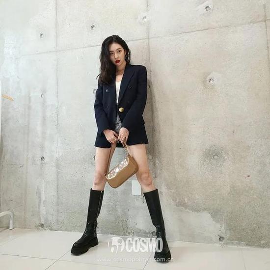 西装裙和靴子天生就分不开,想低调点就拎一只带金属装饰的黑色包包,妮妮告诉你什么是真·修长笔直大长腿。