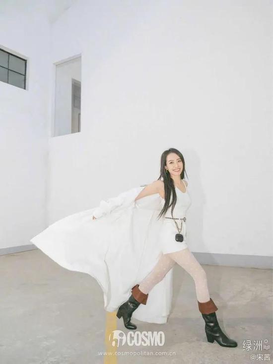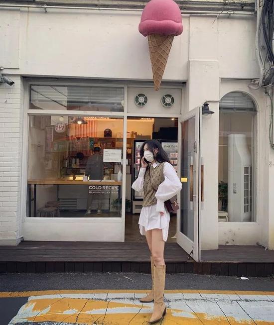 光腿+短裙+中长靴很容易出片儿。泡泡袖爱好者宣美,白色连衣裙和棕色靴的组合实属有些乖巧可爱了。