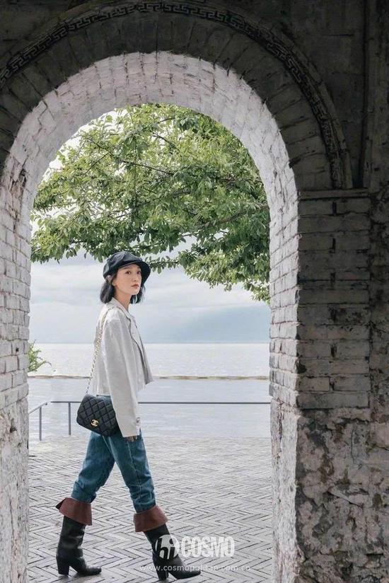白色夹克和牛仔裤组成cp,七里靴在周迅的脚上就有了清新温柔的气质。
