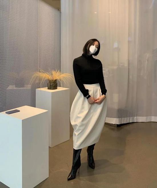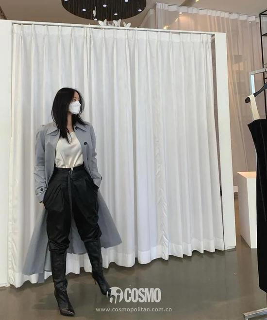 如果担心阔口靴会把小腿拉短,可以套一个同色中筒袜,瘦腿效果立竿见影。