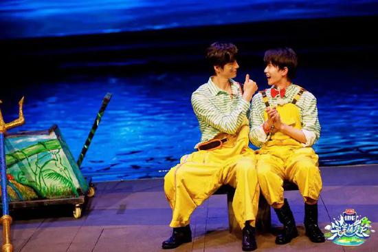 节目中,阿云嘎和黄新淳在舞台上扮演两位渔夫,笨拙可爱的默剧表演逗得小朋友们欢笑连连,捧腹不止。