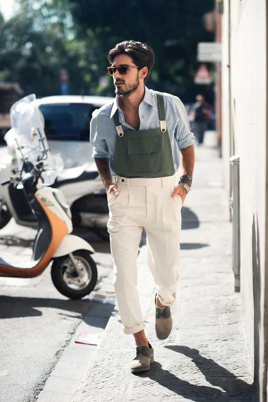 邻家气质的背带裤可以减弱衬衫的商务感,而衬衫的商务感可以中和背带裤带来的随意感,想要商务休闲风的伙伴们可以大胆尝试背带裤+衬衫+皮鞋的搭配组合,尽显儒雅绅士。