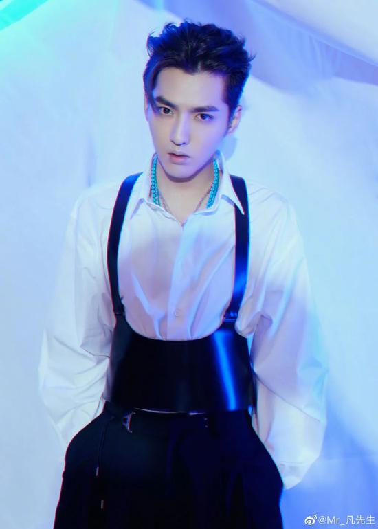 竖条纹衬衫搭配黑色牛仔背带裤,减龄的同时不失优雅,再配合慵懒随性的羊毛卷发型,极具贵族少年气。半透的衬衫材质和衬衣领子下露出的精致锁骨,这是独一无二的坤式性感。