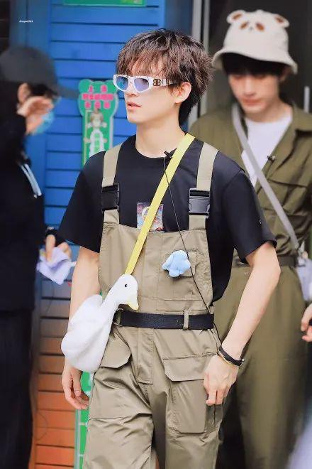 机能风背带裤绑上皮带,突显姚琛优越腰身的同时更显腿长,小白鸭斜挎包和卡通墨镜是这身搭配的点睛之笔,童趣天真的少年系装扮,这一套就够了。