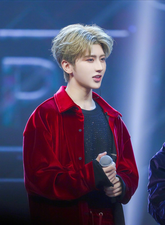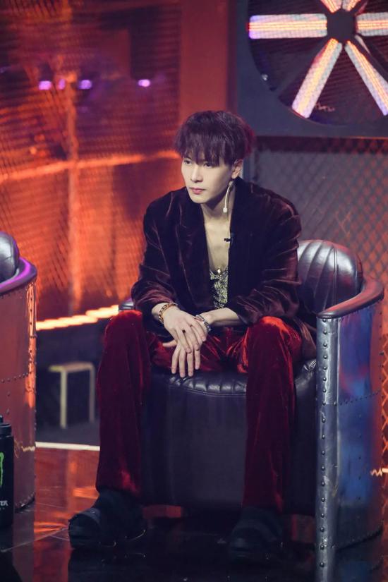 蔡徐坤身着红色丝绒夹克,内搭黑色圆领卫衣勾勒出他完美的颈线,红与黑的反差色使得他在舞台上如同暗夜精灵般耀眼。
