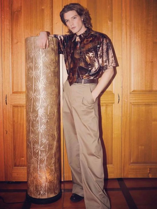 还觉得不够?试试率性复古的焦糖色印花丝绒衬衫吧,有了同款领带的加持轻松营造出80s风。建议下身尽量选择干净简洁的颜色来搭配,出错率就会减小很多。