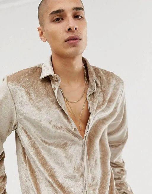 搭配丝绒衬衫时可以选择“上繁下简”的模式,纯色丝绒衬衫与T恤的叠穿让原本单调的造型多了几分活泼的味道。又或是用配饰来加以点缀,从而营造视觉上的层次感。由于上身已经足够吸睛,裤子应尽量选择简单的款式,使整体搭配显得更和谐。