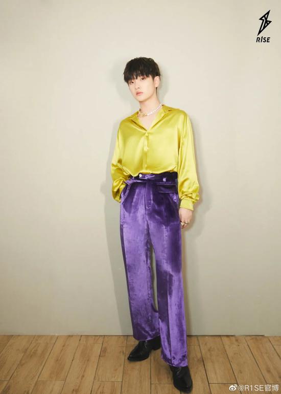 周震南选择了相对较宽松的丝绒西装裤,上身是不带有一丝杂乱的丝绸衬衫,黄与紫撞色尽显潮流个性。脖子上的珍珠亮钻项链作为点睛之笔,给整套look增添一丝优雅。