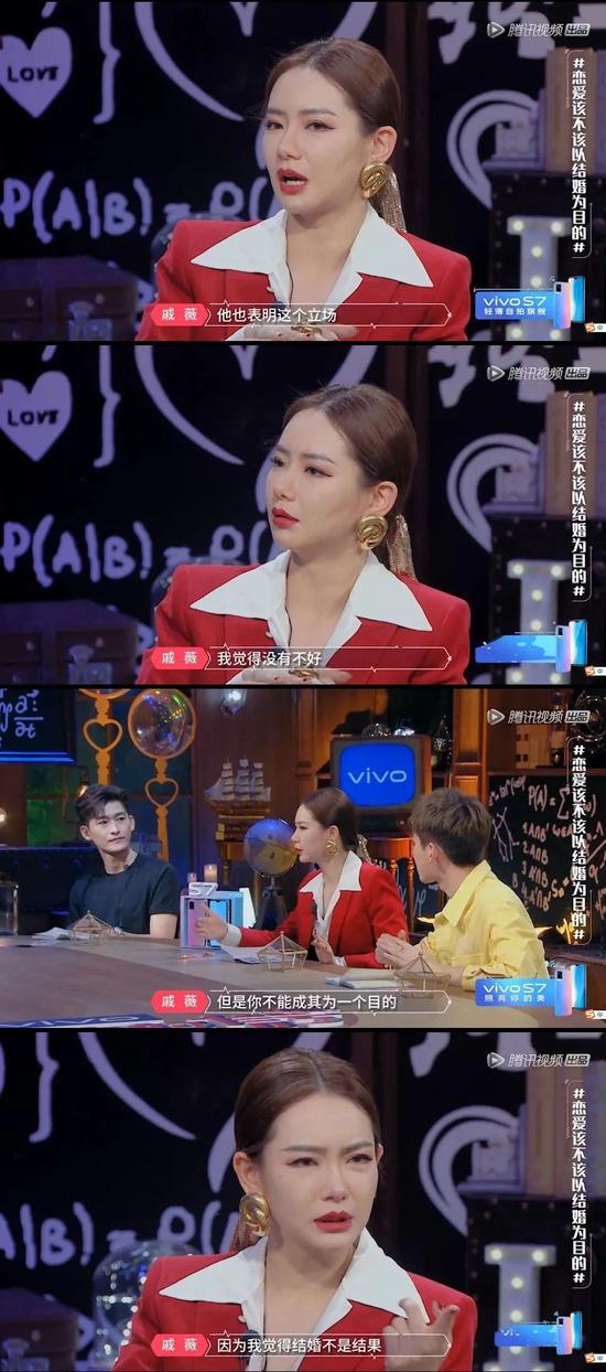 包括节目中聊起嘉宾在恋爱时对婚姻的渴望时,戚薇再爆金句: