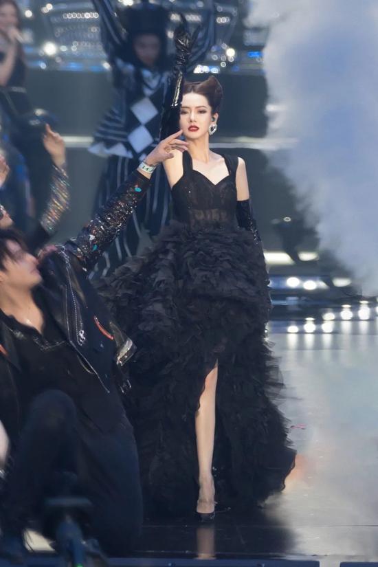 而妆容近看也有亮点,因为从礼服到发饰再到眼妆都是暗黑风格的,整体会比较沉闷。所以戚薇在眼尾到头发的部分装饰了一些水钻,加之红唇,那种危险又诱惑的感觉就出来了。