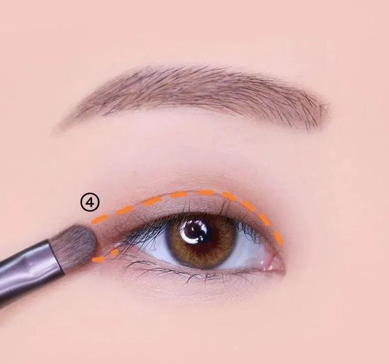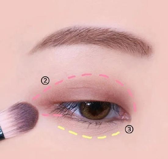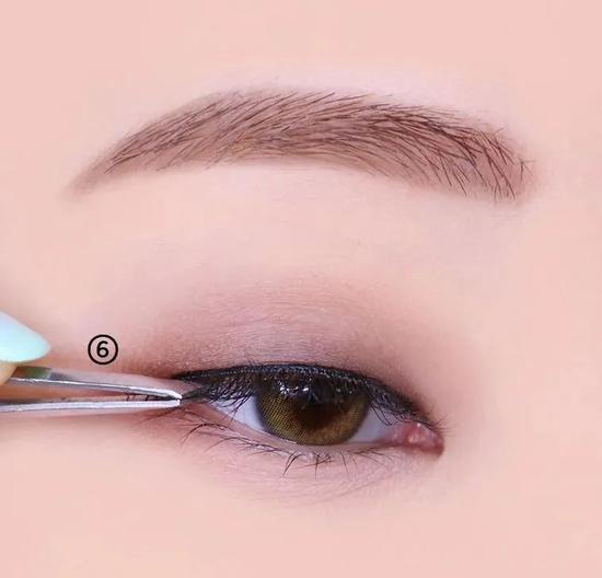 选取一个棕黑色眼影贴着睫毛根部画在双眼皮范围内。