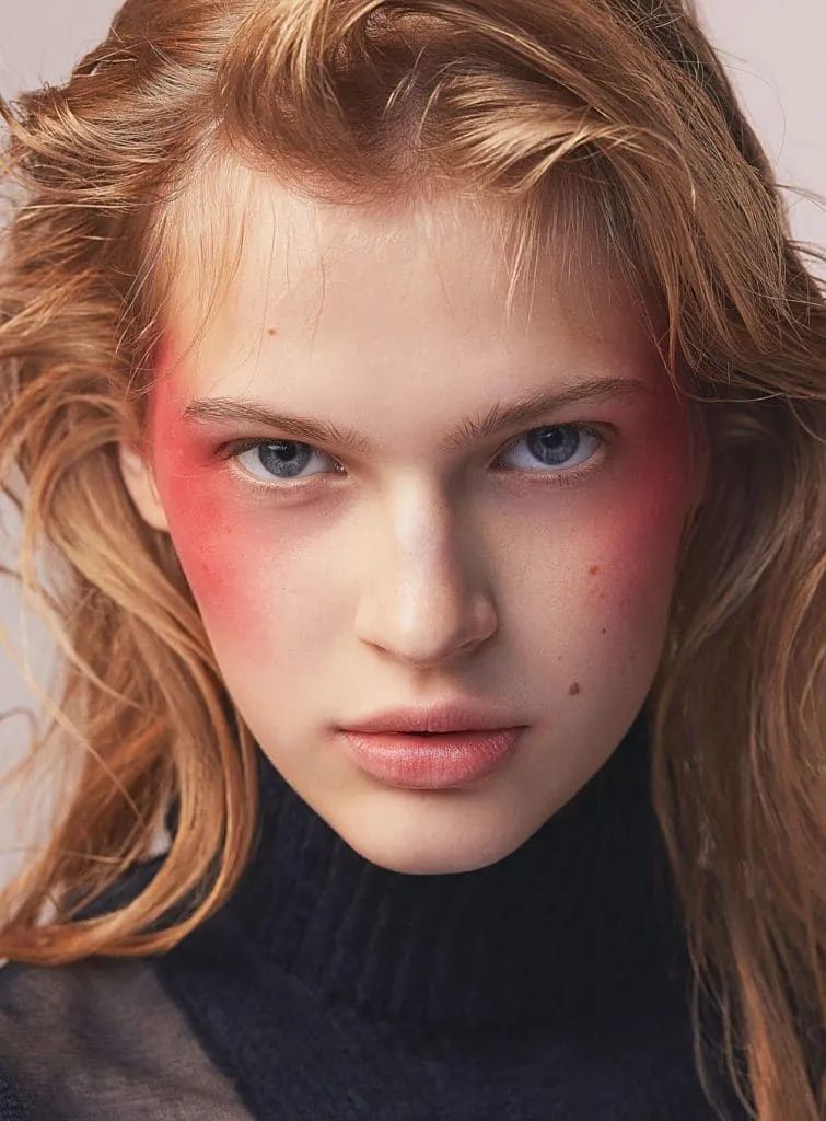 腮红和眼妆的迥异风格,碰撞出一种的巧妙美感。而从两颊蔓延到鼻梁的大面积腮红晕染,让妆容活力值也明显提升,视觉上也很减龄。