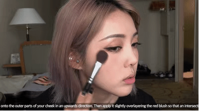 眼尾腮红是扫在眼角,靠近太阳穴的位置晕染开,记得腮红颜色和妆面颜色要一致协调,才不会有突兀感~