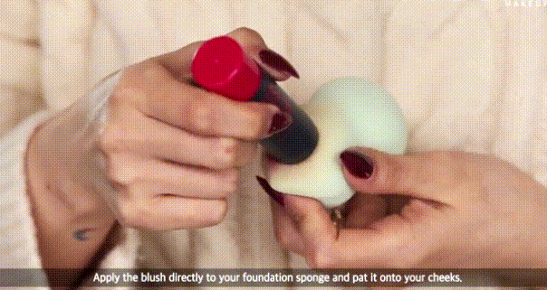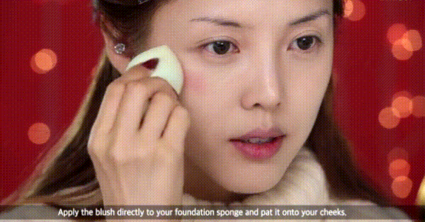 step2,点涂在两颊,用美妆蛋均匀晕染开来,延展到太阳穴的位置。