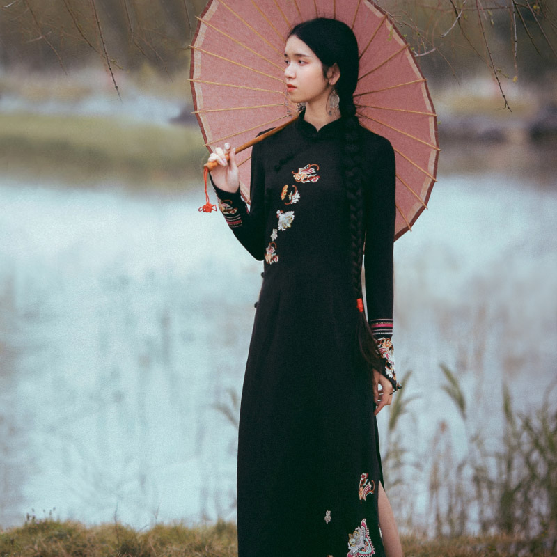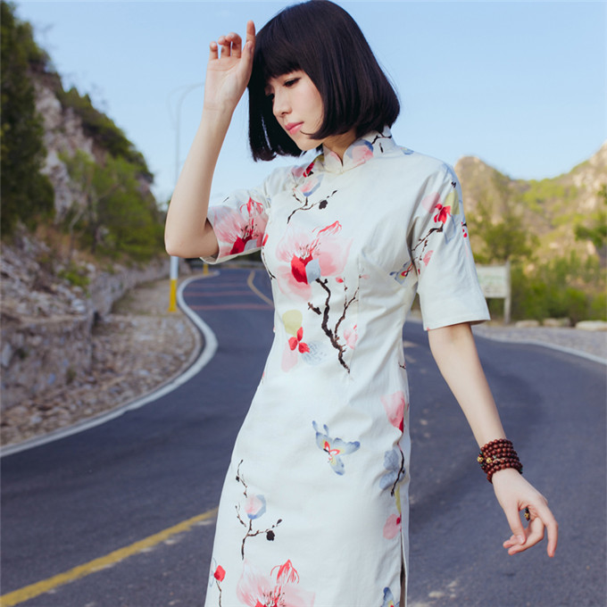 民国的元素总是让不少喜欢古典装扮的女生为之倾倒,手绘白兰花的设计,更是将那个年代女性纯洁,优雅的气质还原到现代当中,中长款的造型,看似保守传统,但女性婀娜迷人的身姿缺完美地呈现出来。精致的立领设计,让旗袍的优雅气质得以保存,更是在古典端庄中秀出几分女性的温柔之美。复古盘扣的选择,散发着绵绵的东方情怀,低调中又不失高贵。加上别致的袖口处理,将现代时尚与古典元素有机地融合在一起,极具美感。