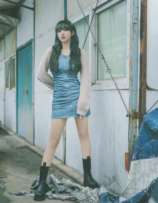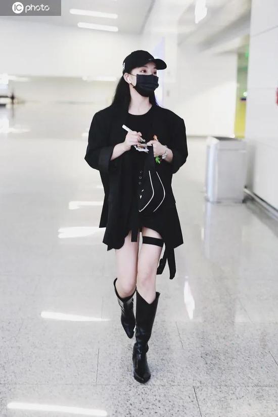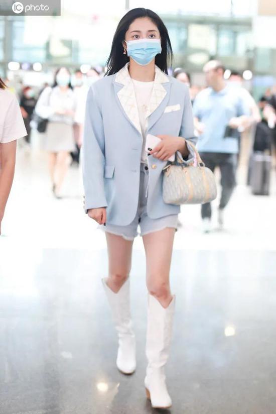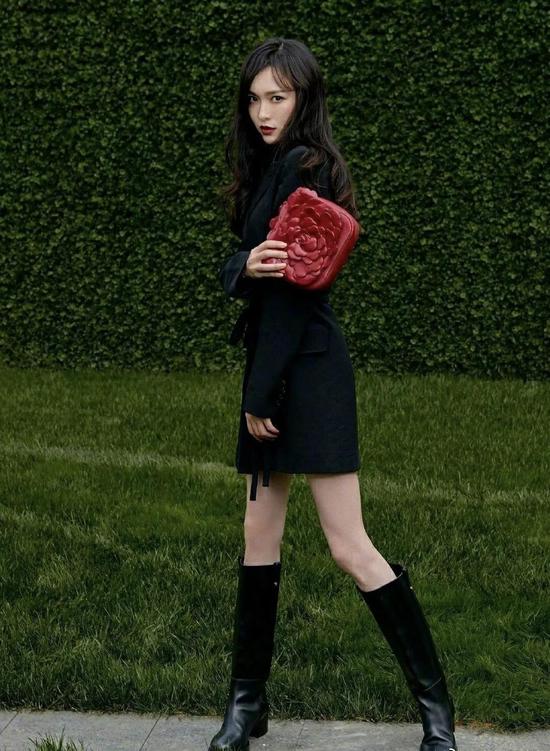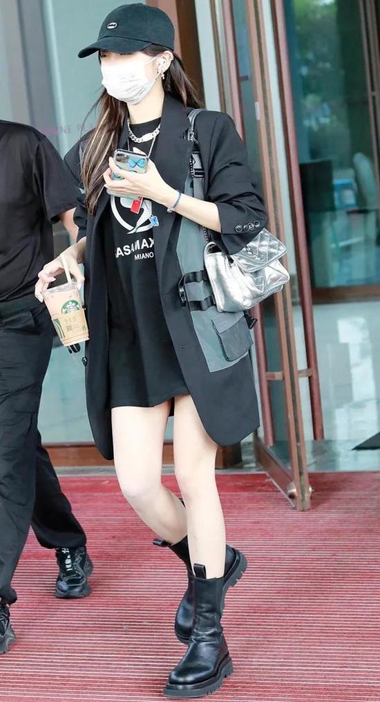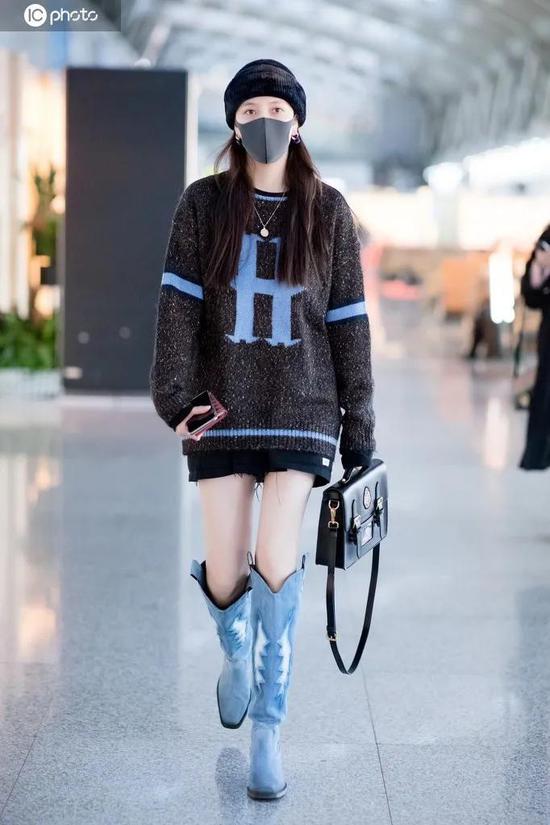 宋妍霏用下衣失踪的方式搭配及膝靴,腿显得又细又直,也正好适合初秋的温度。