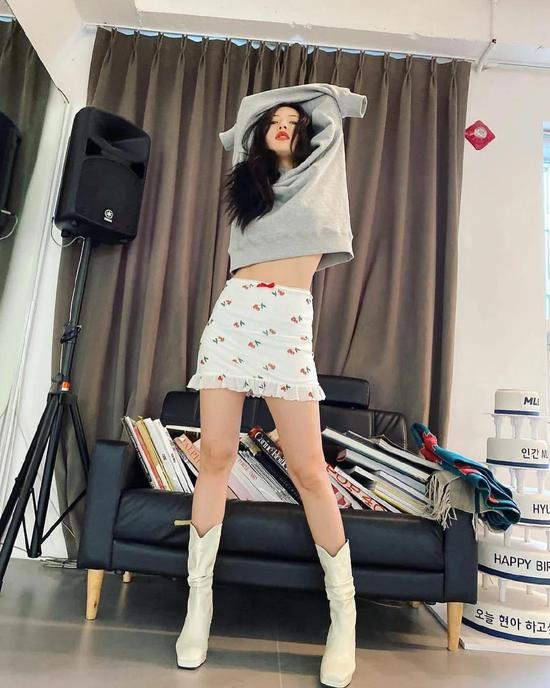 除了打歌舞台,泫雅的私服也常常宠幸牛仔靴。碎花小短裙搭上略显粗犷的靴形,既甜美又野性。