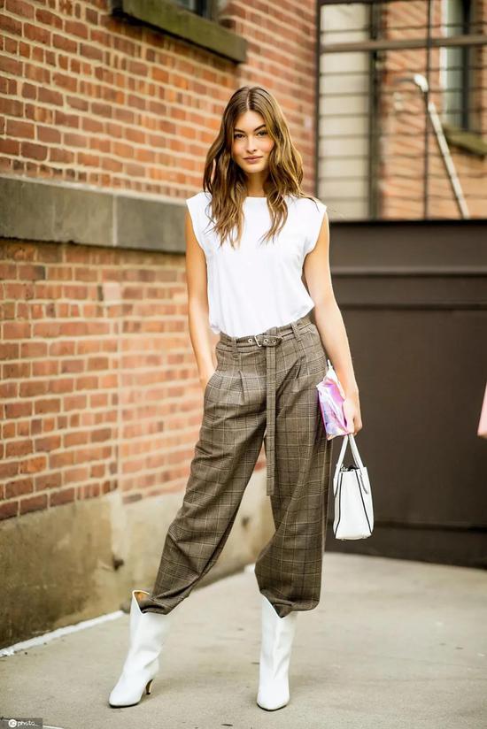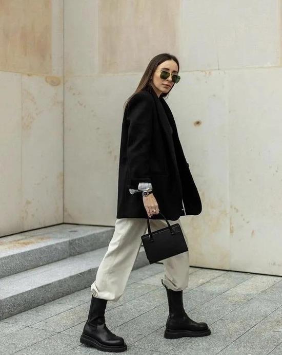 把宽松的裤腿扎进靴子,随性又干练,更不用担心显腿粗。