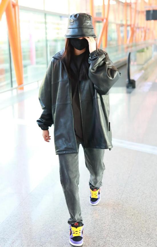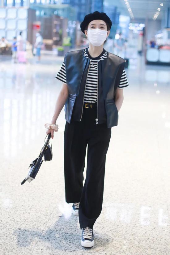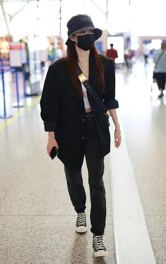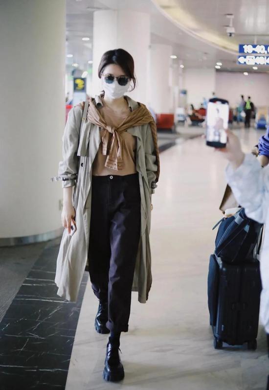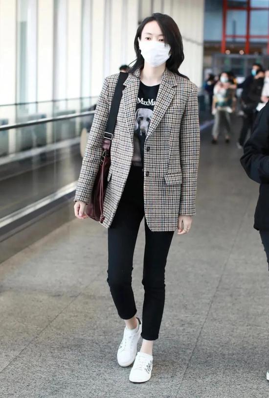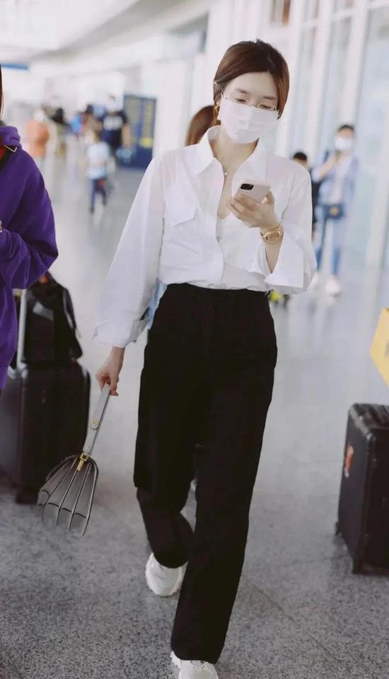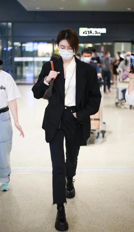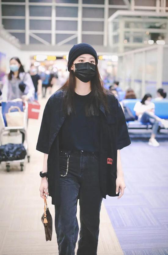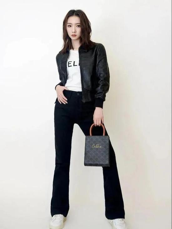 更进阶一步的层次搭配可以跟江疏影学习,同样是黑色仔裤,但在江疏影身上有种“化普通为神奇”的魅力。她会用叠背包包、外搭披肩、丝巾帽子装饰等方式来丰富层次感。