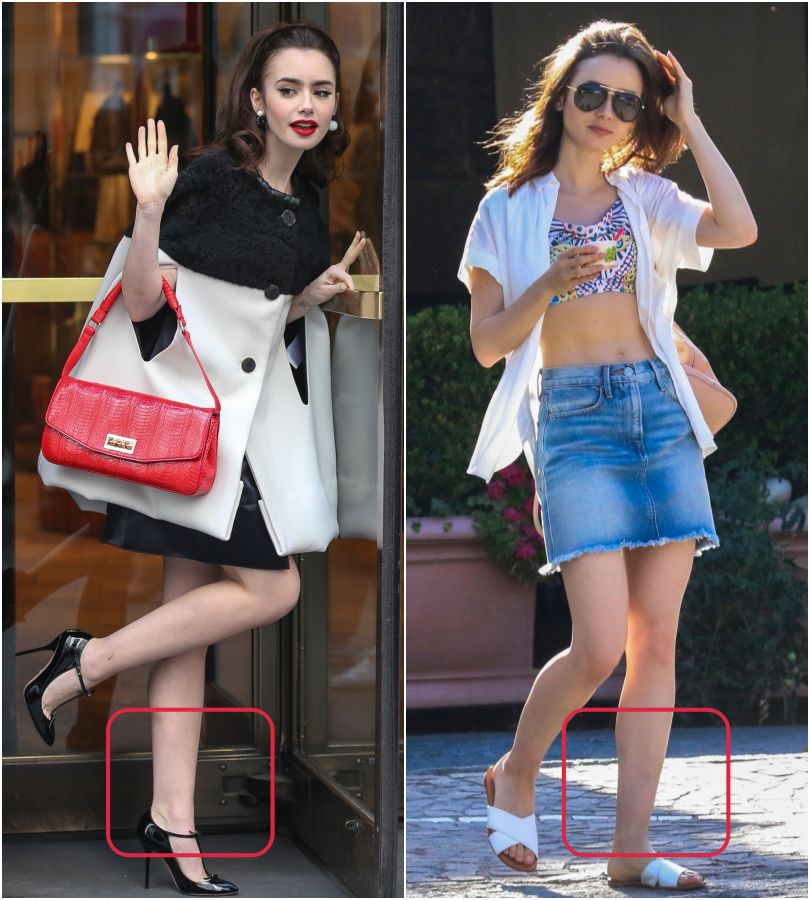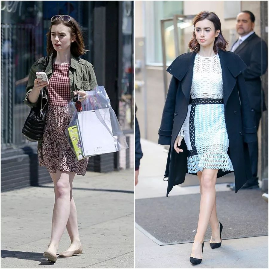 Lily Collins其实并不胖,有段时间健身变瘦后,即使穿平底鞋,脚踝也比以前穿高跟鞋细,腿部线条也更好看。▼