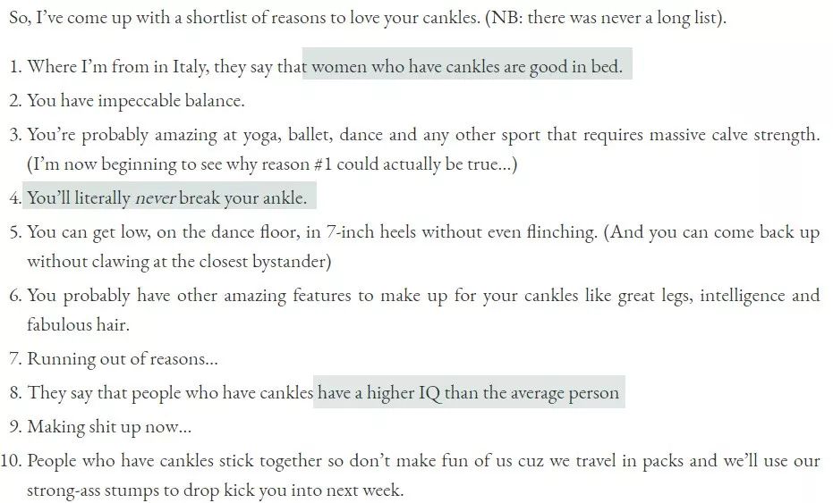 博主Jetset Justine,在一篇文章中洋洋洒洒列举了爱上粗脚踝的十大理由,亮点自寻,我就不翻译了哈哈~▼