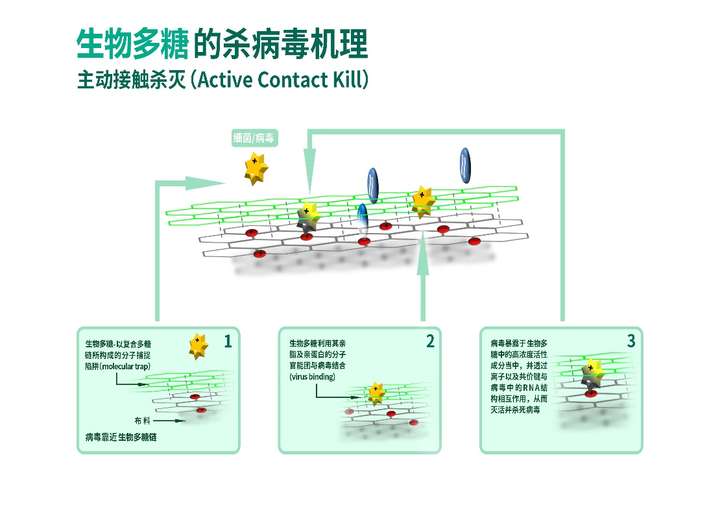 整个灭活过程按我的理解是这样的:生物多糖布下陷阱,对靠近的病毒进行捕获,使病毒长期处于高浓度活性成分中,通过生物化学反应搞死病毒。