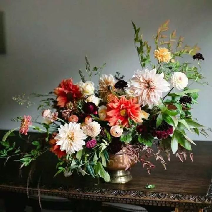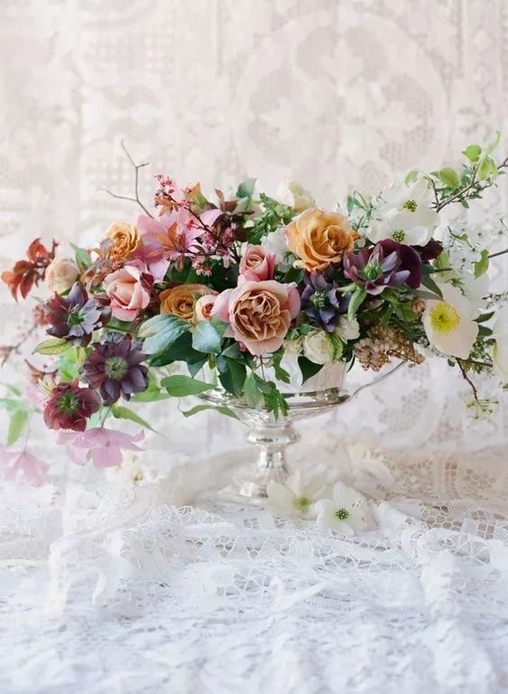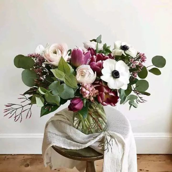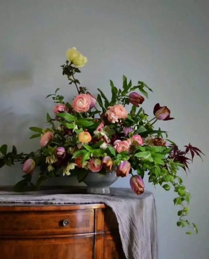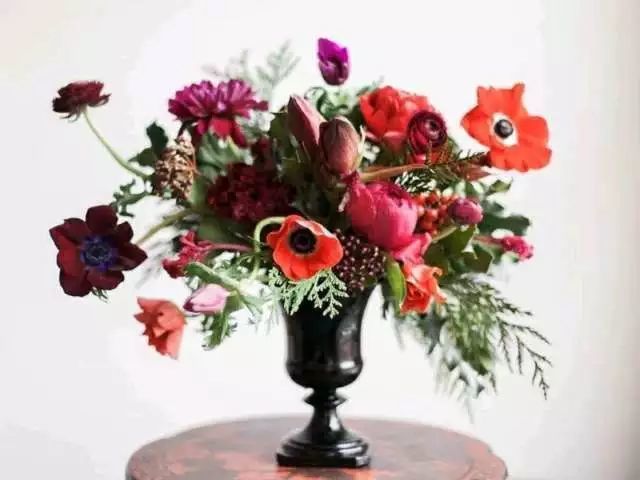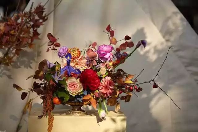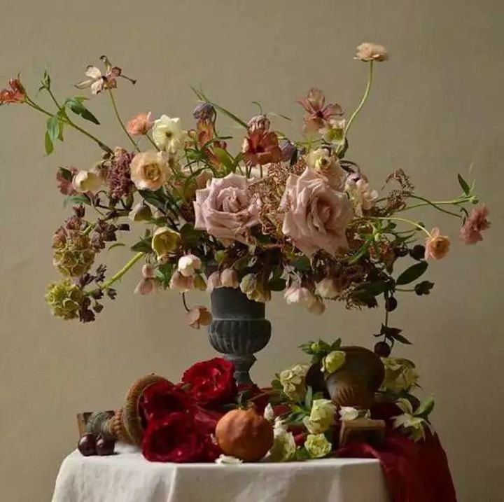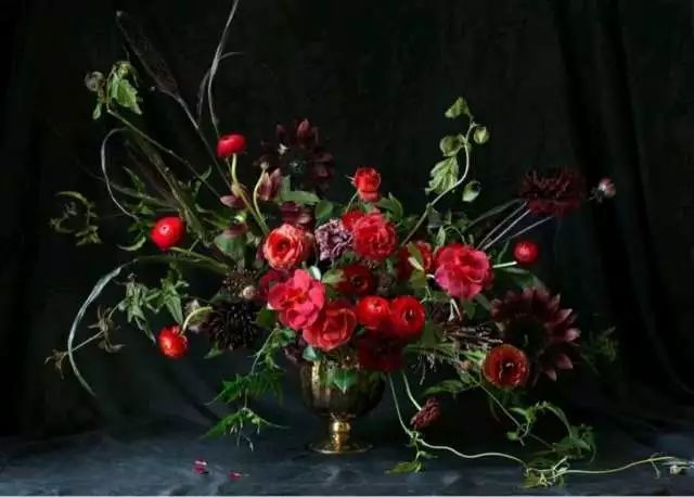复古花艺的色调,基本以正红、深红、暗红、金色、橙色、香槟色、绿色、墨绿色、紫色、黑紫色、白色等为主色调,整体的搭配避免明艳,给人一种古典之美。