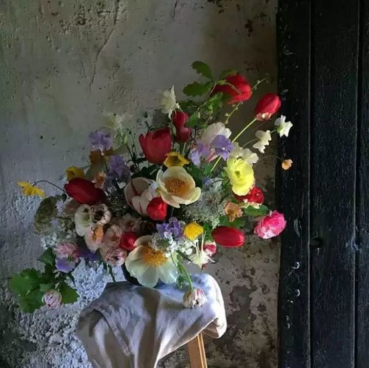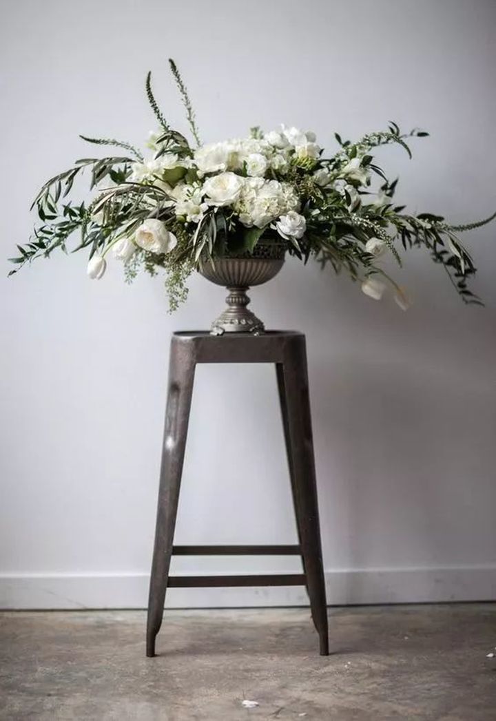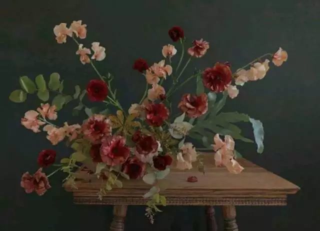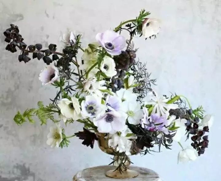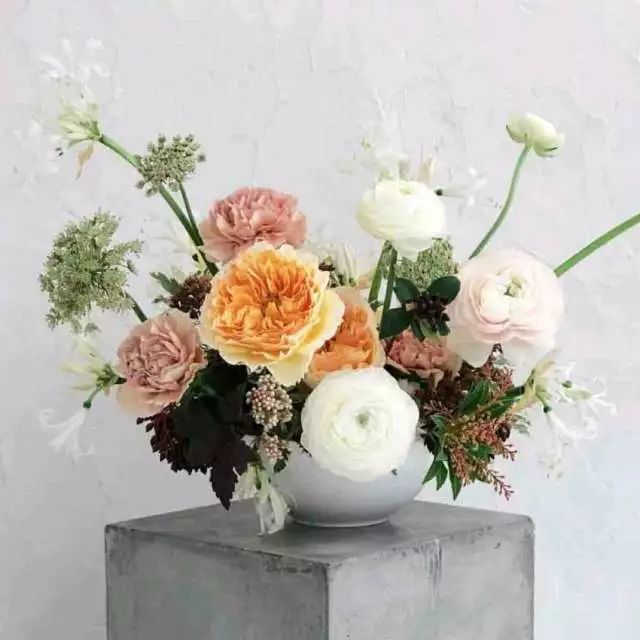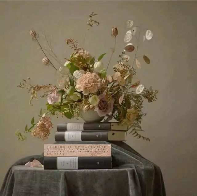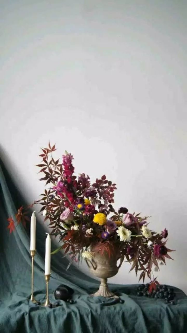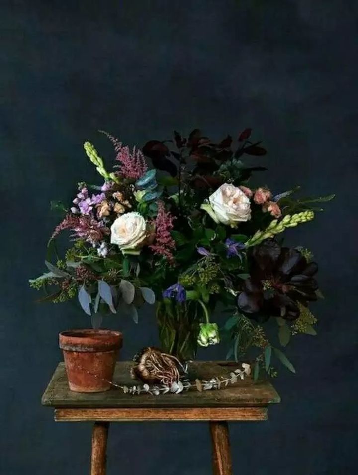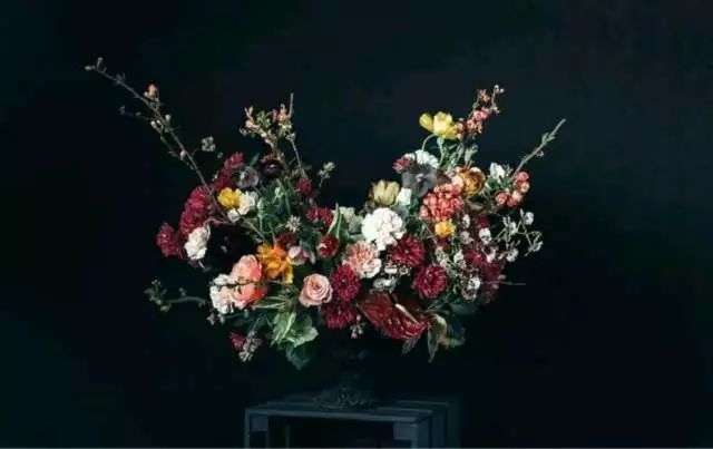 而花艺作品也经常会放置在黑色、白色、墨色、灰色、旧色等为背景的环境中,更能凸显作品的优雅高贵和复古的质感。