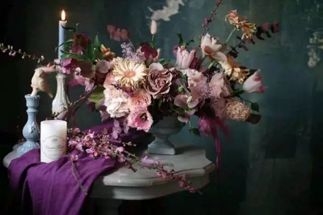而为了更好的突出复古花艺的韵味,将古典之气更加浓重的塑造出来,一些复古元素的搭配也是少不了的。如书籍、烛台、蜡烛、素雅桌布、木头、蕾丝制品、枯草、旧桌木椅等,效果极佳。