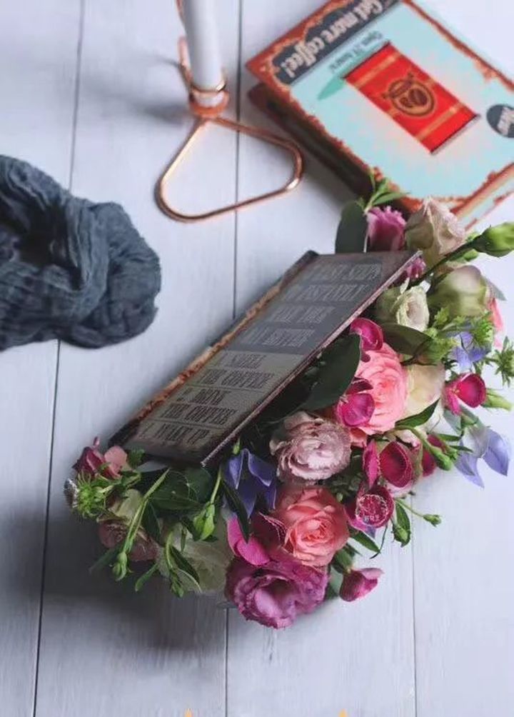 除了以上几种花器外,还有草编花篮、古典书花器、木质花器等也会用到。像传统的玻璃瓶器、盆器等也会出现在西方复古花艺中。而具有中国特色的古典瓶器、盆器等也是西方花艺极受欢迎的花器。