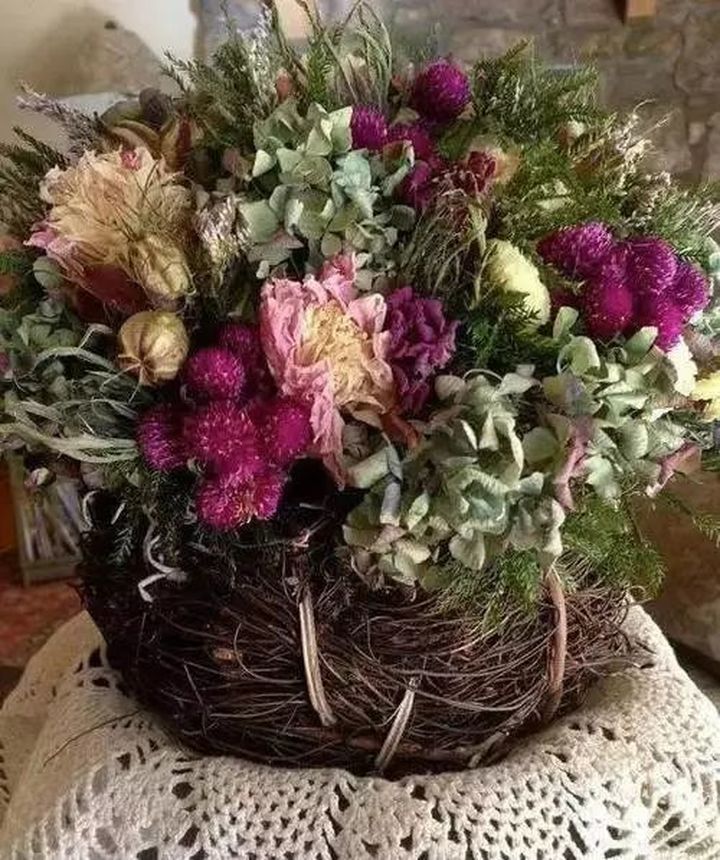 此外,干花的材质、色泽也非常适合用在复古花艺中,与古典的瓷器、餐具等搭配,相得益彰。