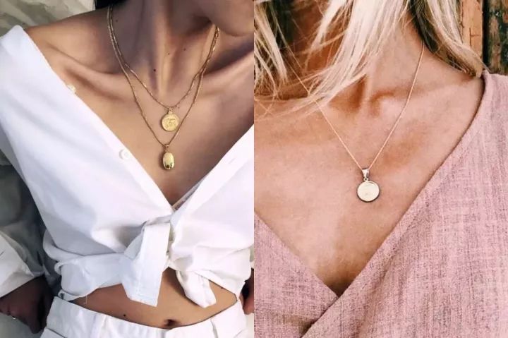 这两年很火这款金属吊坠叫coin necklace,复古文艺范儿,无论搭衬衫、T恤还是毛衣,都毫不违和。