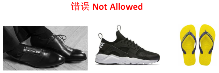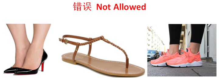 普通帆布鞋运动鞋,商务皮鞋,莫卡辛鞋,拖鞋都是不可以的。