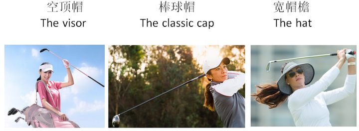 女士多选择空顶帽, 也有棒球帽,甚至有些女士会选择大帽檐的帽子。