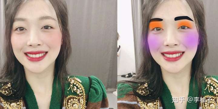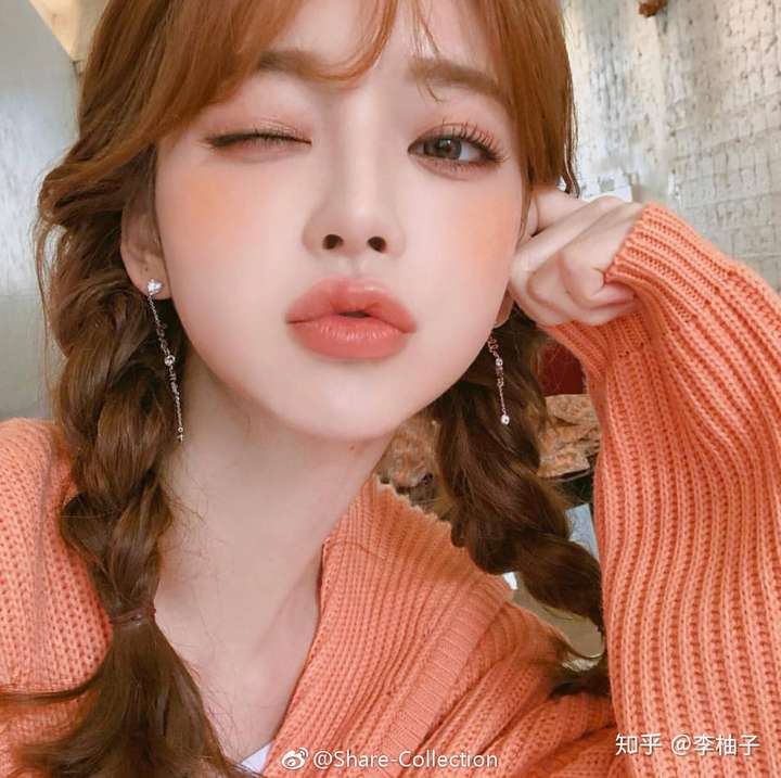 微博上一个韩国网红妹子,颜色搭配是更高阶的,就是妆容跟衣服统一,举个例子,穿了橙色的上衣,就画了橙色系的妆容
