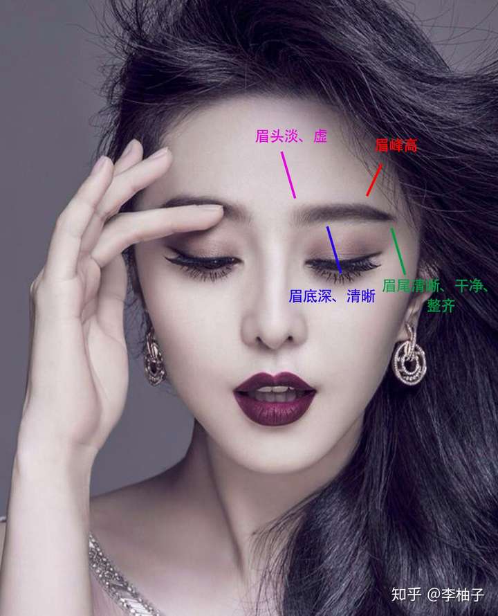 眉头淡、虚,眉底深、清晰;眉峰高;眉尾清晰、干净、整齐。