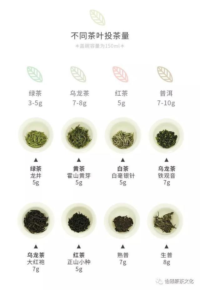 茶类不同,投茶量也会不同,假设150ml的盖碗,投茶量应该如下图