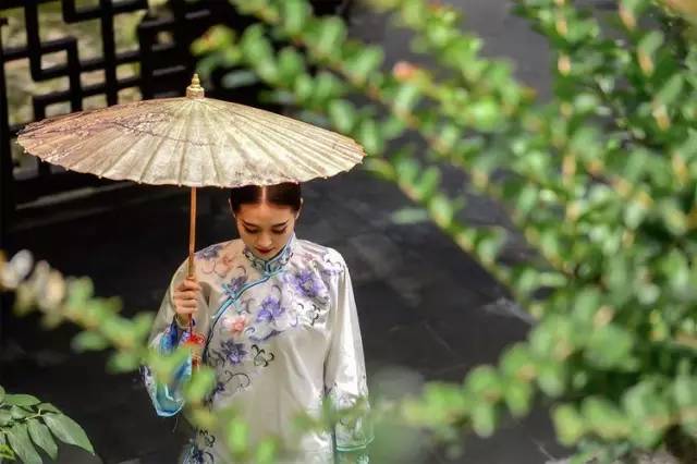 纤腰玉带舞天纱,行动如弱柳扶风,旗袍让女子的柔弱彰显,此时持一把能为之遮蔽的花纸伞,柔弱加倍,愈看愈怜……