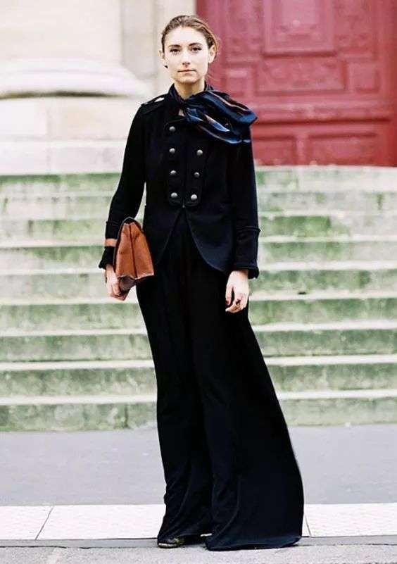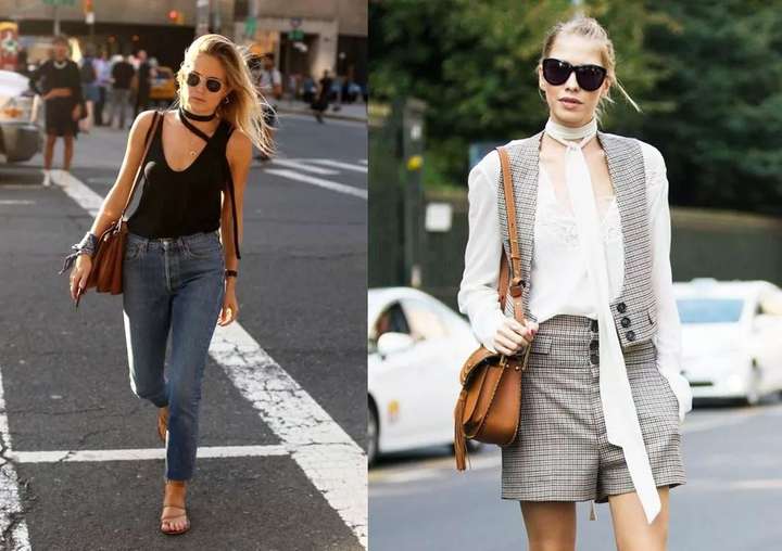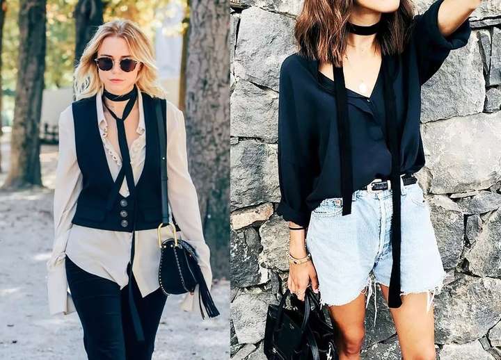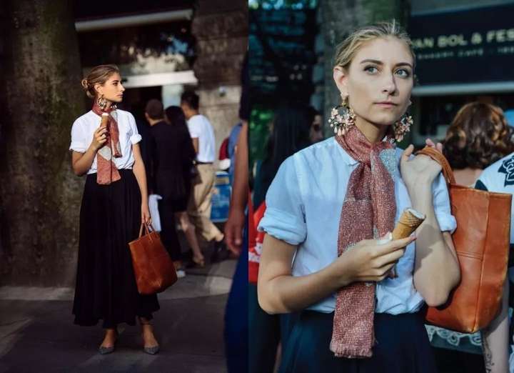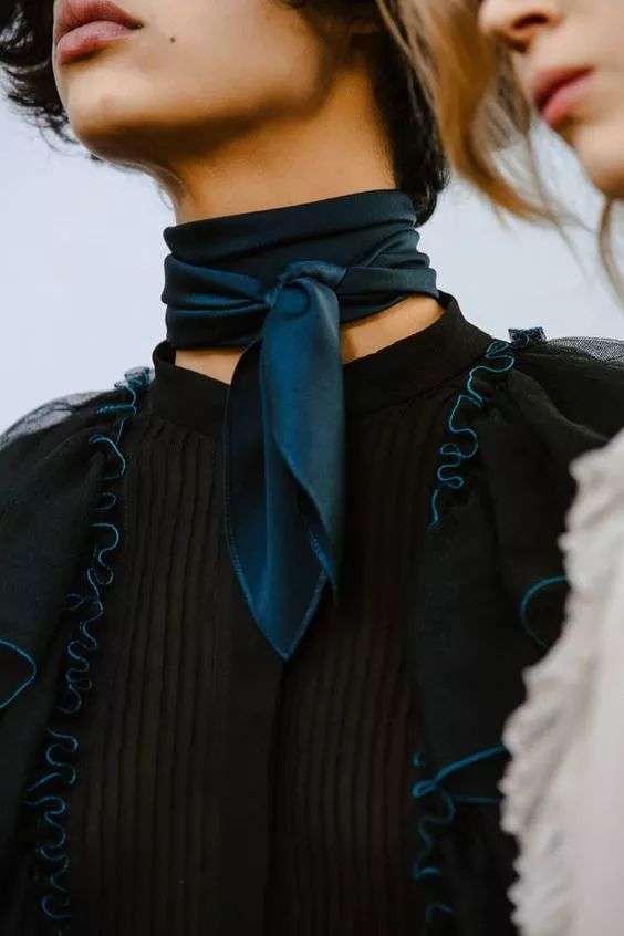上面介绍的丝巾如果你觉得还是很难hold住,最近两年流行的系带衬衫和黑白窄丝巾值得懒人一试。