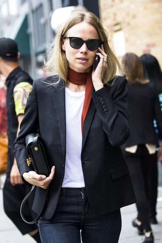 平常喜欢穿黑白灰,但是希望穿搭有点小细节,那么可以利用亮色的丝巾去搭配整体穿搭。