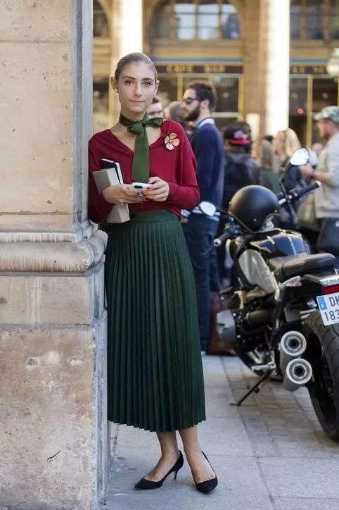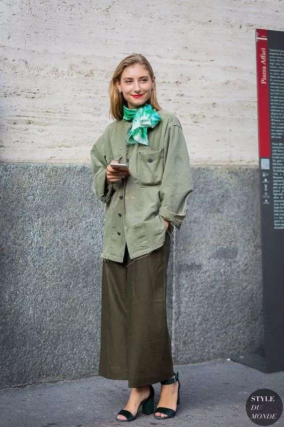➤全身同色系搭配:第一张图是全身绿色系搭配,绿色的丝巾提亮了整体穿搭。